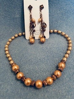 A set to wear from work to evening. This (faux) pearl look, 17 inch necklace is a classic until you spot the burgundy iridescent elements. It definitely adds the WOW factor to this beautiful set. The earrings have those (faux) pearls too and also set in antique copper. Not matchy, matchy BUT certainly a complete image.