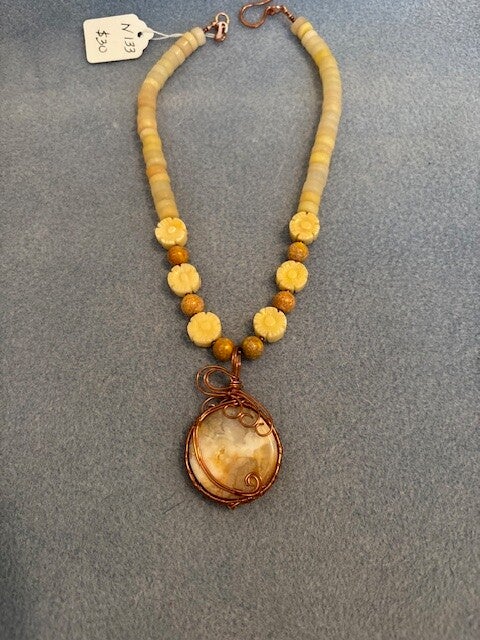 A gorgeous Chacedony stone wire wrapped in copper mounted on a chain made of pale yellow and gold colored beads in an lovely layout. Chalcedony is known to be tied to emotional balance, comunication and inner peace. Who does want that?!